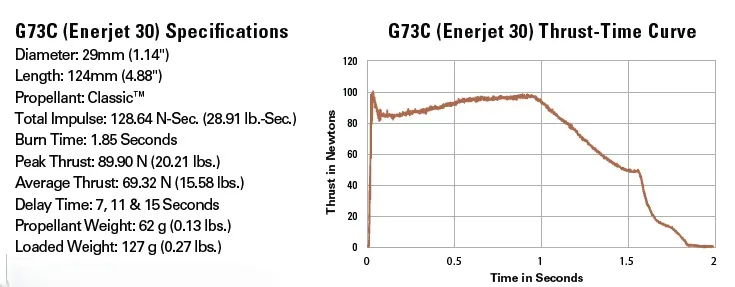 The G73C uses AeroTech’s Classic™ composite propellant, producing a fast, aggressive burn that delivers 128.64 N-sec (28.91 lb-sec) of total impulse over a 1.85-second burn time. With a peak thrust of 89.90 N (20.21 lbs) and an average thrust of 69.32 N (15.58 lbs), this motor provides authoritative lift-offs well suited for heavier mid-power airframes and high-drag designs.