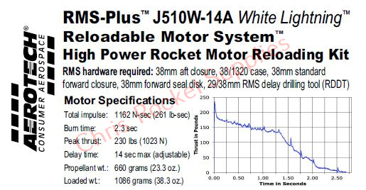 This RMS motor reload utilizes RCSs exclusive White Lightning™ aerospace grade composite propellant formulation, which produces a gorgeous bright white flame with lots of dense white smoke and a throaty roar at lift-off.