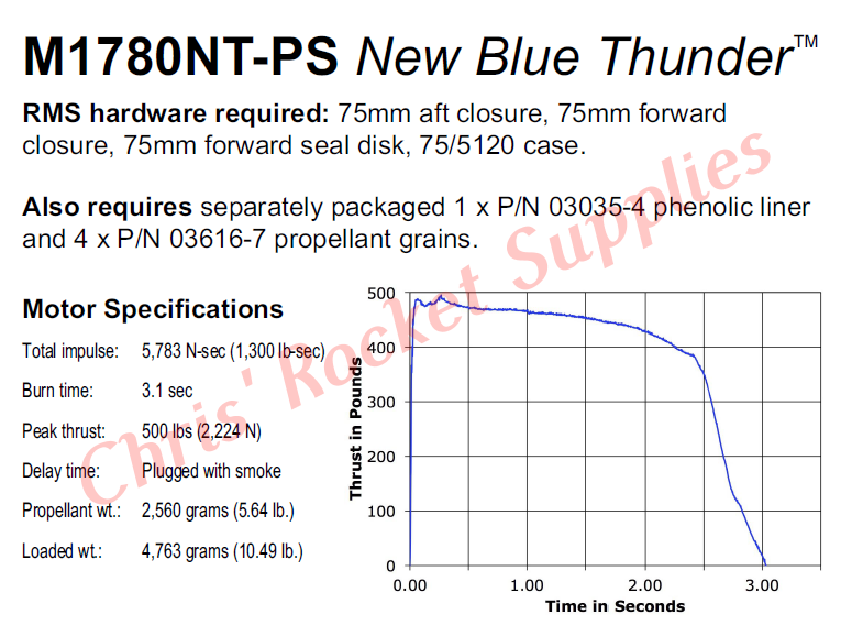 This RMS motor reload utilizes RCSs exclusive New Blue Thunder™ aerospace grade composite propellant formulation, which produces a beautiful intense blue exhaust jet studded with prominent “mach diamonds.” New Blue Thunder™ motors provide a higher level of thrust than White Lightning™ motors of the same total impulse and are perfect for high lift-off acceleration.